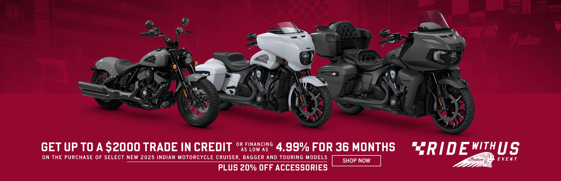 This is a limited time offer which is valid for the purchase of selected qualifying models and is subject to credit approval on qualified purchases financed during this program. Offer may not be combined with certain other offers (specifically trade-in credit), is subject to change and may be extended or terminated without further notice. Offer valid on select new 2025 models (excludes Elites): MY25 Indian Springfield models, MY25 Chieftain models, MY25 Roadmaster models, MY25 PowerPlus family (Chieftain PowerPlus, Roadmaster PowerPlus, Indian Challenger, or Indian Pursuit), or MY25 Chief models (2025 Indian Chief, Chief Bobber, Super Chief and Sport Chief models). Monthly payment and cost of borrowing will vary depending on amount borrowed and down payment/trade. Minimum amount to finance is $5,000. Example: $14,999 financed at 4.99% APR over 36 months = 36 monthly payments of $379; financed amount of $13,499 with 10% down payment, total cost of borrowing of $1,064 and a total obligation of $14,563. An example of monthly payments required on a 36-month term at 4.99% APR is $29.97 per $1,000 financed. Monthly payment examples do not include taxes, title, and other fees. Offer only valid to qualified customers, not all customers will qualify, other offers available, see dealer for details. Excludes all Elite Models. Offer Valid:October 1 - 31, 2025.                                                                                                                                                                                                                                                                                                                                                                                                                                                                                                                                                                                                                2025 Roadmaster and Chieftain Models $2,000 Trade-In Credit This is a limited time offer which consists of $2,000 Trade-In Credit towards the purchase of a new model year 2025 Chieftain, or Roadmaster model. Excludes Elite models. This offer is subject to change and may be extended or terminated without further notice. Offer may not be combined with promotional financing. All rebates paid to dealer and are not redeemable for cash. Offer Valid: October 1 – 31, 2025.                                                                                                                                                                                      2025 Indian Challenger $1,000 Customer Cash